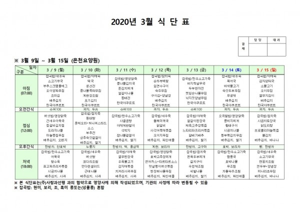 3월 둘째주 식단표 페이지 정보 작성자 은천노인복지회 작성일20-03-23 14:49 조회180,536회 댓글0건 관련링크 이전글 다음글 목록 답변 본문 . 이전글 다음글 목록 답변
