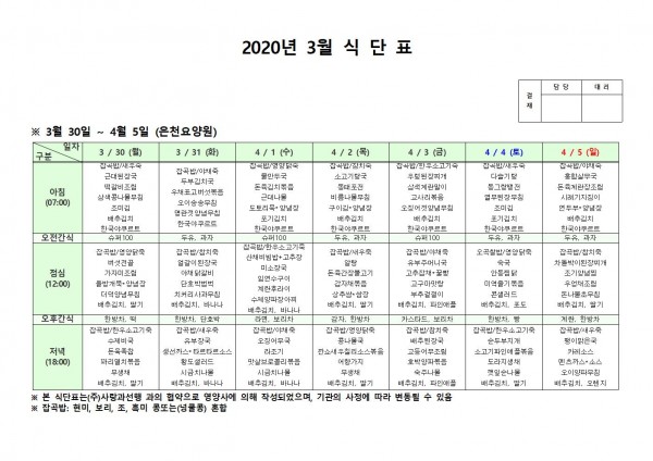 3월 다섯째주 식단표 페이지 정보 작성자 은천노인복지회 작성일20-04-06 14:47 조회179,345회 댓글0건 관련링크 이전글 다음글 목록 답변 본문 . 이전글 다음글 목록 답변