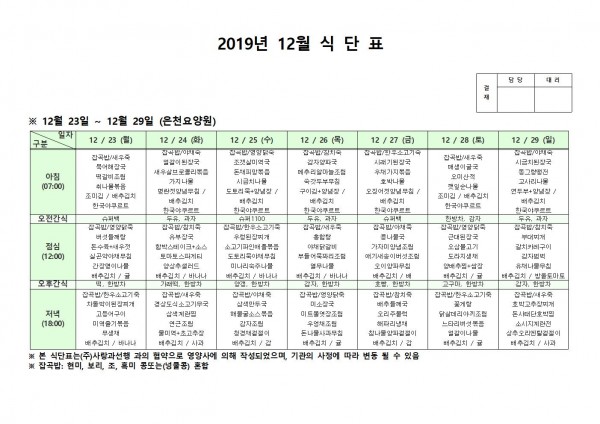 12월 넷째주 식단표 페이지 정보 작성자 은천노인복지회 작성일19-12-30 14:32 조회189,010회 댓글0건 관련링크 이전글 다음글 목록 답변 본문 12월 넷째주 식단표입니다 이전글 다음글 목록 답변