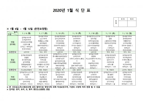 1월 첫째주 식단표 페이지 정보 작성자 은천노인복지회 작성일20-01-13 10:55 조회187,458회 댓글0건 관련링크 이전글 다음글 목록 답변 본문 1월 첫째주 식단표입니다. 이전글 다음글 목록 답변
