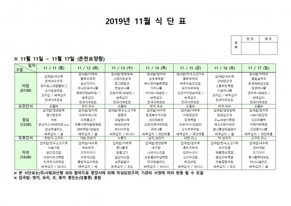 11월 둘째주 식단표 페이지 정보 작성자 은천노인복지회 작성일19-11-18 14:46 조회193,498회 댓글0건 관련링크 이전글 다음글 목록 답변 본문 11월 둘째주 식단표 이전글 다음글 목록 답변