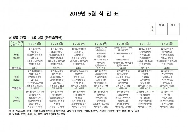 5월 넷째주 식단표 페이지 정보 작성자 은천노인복지회 작성일19-06-10 11:56 조회202,966회 댓글0건 관련링크 이전글 다음글 목록 답변 본문 5월 넷째주 식단표 이전글 다음글 목록 답변