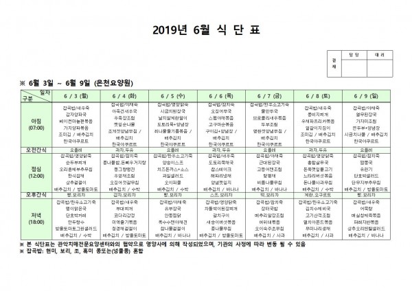 6월 첫째주 식단표 페이지 정보 작성자 은천노인복지회 작성일19-06-10 11:57 조회202,415회 댓글0건 관련링크 이전글 다음글 목록 답변 본문 6월 첫째주 식단표 이전글 다음글 목록 답변