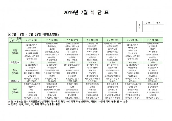 7월 셋째주 식단표 페이지 정보 작성자 은천노인복지회 작성일19-07-22 11:09 조회199,431회 댓글0건 관련링크 이전글 다음글 목록 답변 본문 7월 셋째주 식단표 이전글 다음글 목록 답변