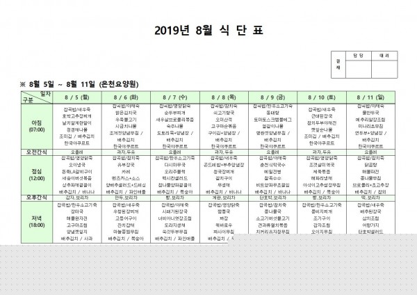 8월 둘째주 식단표 페이지 정보 작성자 은천노인복지회 작성일19-08-19 15:26 조회197,914회 댓글0건 관련링크 이전글 다음글 목록 답변 본문 8월 둘째주 식단표 이전글 다음글 목록 답변