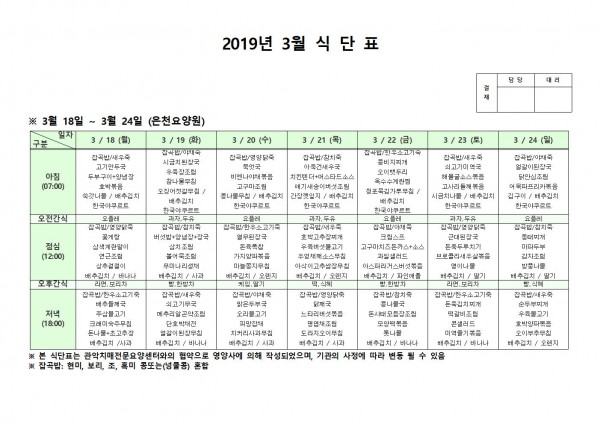 3월 셋째주 식단표 페이지 정보 작성자 은천노인복지회 작성일19-03-25 11:11 조회205,960회 댓글0건 관련링크 이전글 다음글 목록 답변 본문 3월 셋째주 식단표 이전글 다음글 목록 답변