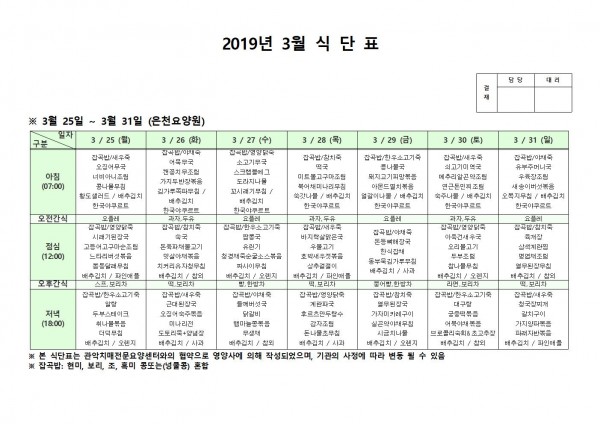 3월 넷째주 식단표 페이지 정보 작성자 은천노인복지회 작성일19-04-01 11:06 조회205,854회 댓글0건 관련링크 이전글 다음글 목록 답변 본문 3월 넷째주 식단표 이전글 다음글 목록 답변
