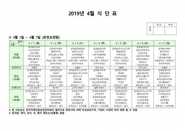 4월 첫째주 식단표 페이지 정보 작성자 은천노인복지회 작성일19-04-08 11:56 조회206,582회 댓글0건 관련링크 이전글 다음글 목록 답변 본문 4월 첫째주 식단표 이전글 다음글 목록 답변