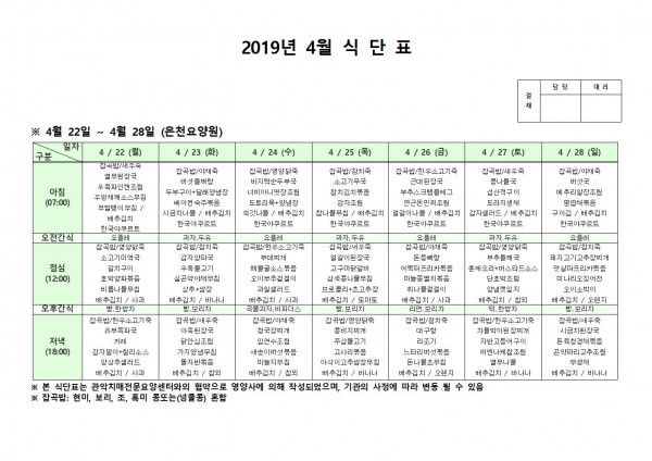 4월 넷째주 식단표 페이지 정보 작성자 은천노인복지회 작성일19-04-29 10:14 조회206,692회 댓글0건 관련링크 이전글 다음글 목록 답변 본문 4월 넷째주 식단표 이전글 다음글 목록 답변