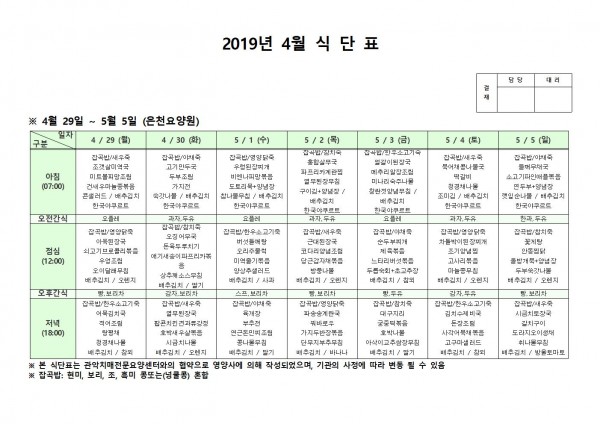 4월 다섯째주 식단표 페이지 정보 작성자 은천노인복지회 작성일19-05-07 14:13 조회205,720회 댓글0건 관련링크 이전글 다음글 목록 답변 본문 4월 다섯째주 식단표 이전글 다음글 목록 답변