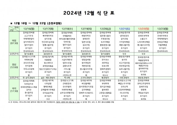 12월 셋째주 식단표 페이지 정보 작성자 은천노인복지회 작성일24-12-13 09:36 조회20,264회 댓글0건 관련링크 이전글 다음글 목록 답변 본문 . 이전글 다음글 목록 답변