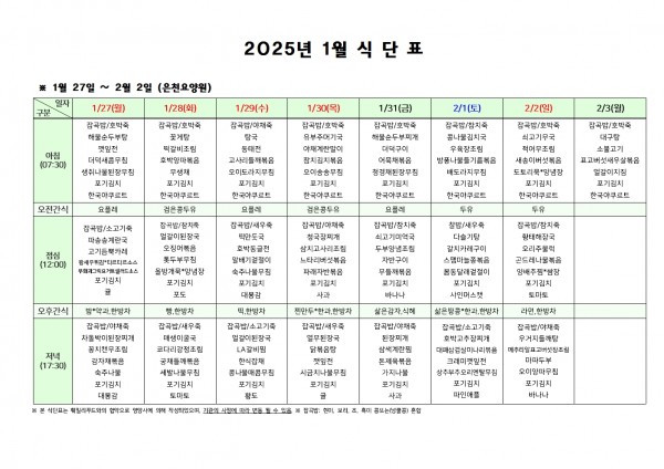 1월 다섯째주 식단표 페이지 정보 작성자 은천노인복지회 작성일25-01-24 10:07 조회16,966회 댓글0건 관련링크 이전글 다음글 목록 답변 본문 . 이전글 다음글 목록 답변