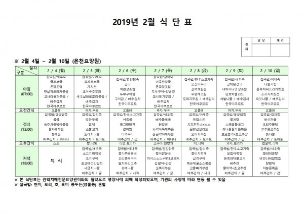 2월 첫째주 식단표 페이지 정보 작성자 은천노인복지회 작성일19-02-13 17:29 조회207,559회 댓글0건 관련링크 이전글 다음글 목록 답변 본문 2월 첫째주 식단표 이전글 다음글 목록 답변