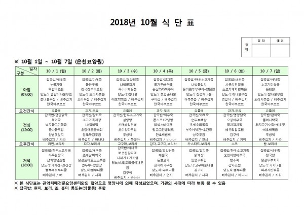 10월 첫째주 식단표 페이지 정보 작성자 은천노인복지회 작성일18-10-08 11:06 조회205,864회 댓글0건 관련링크 이전글 다음글 목록 답변 본문 10월 첫째주 식단표 이전글 다음글 목록 답변