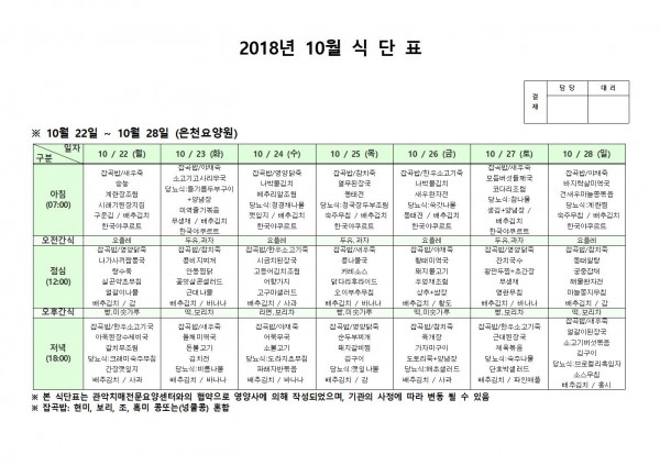 10월 넷째주 식단표 페이지 정보 작성자 은천노인복지회 작성일18-10-30 09:49 조회207,421회 댓글0건 관련링크 이전글 다음글 목록 답변 본문 10월 넷째주 식단표 이전글 다음글 목록 답변