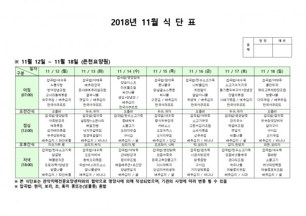 11월 2주째 식단표 페이지 정보 작성자 은천노인복지회 작성일18-12-07 09:37 조회208,602회 댓글0건 관련링크 이전글 다음글 목록 답변 본문 11월 2주째 식단표 이전글 다음글 목록 답변