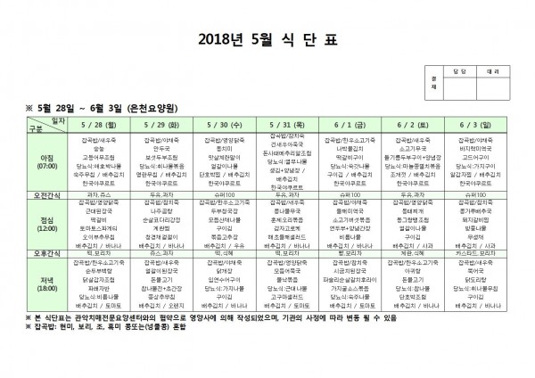 5월 다섯째주 식단표 페이지 정보 작성자 은천노인복지회 작성일18-06-07 10:39 조회207,967회 댓글0건 관련링크 이전글 다음글 목록 답변 본문 5월 다섯쨰주 식단표 이전글 다음글 목록 답변