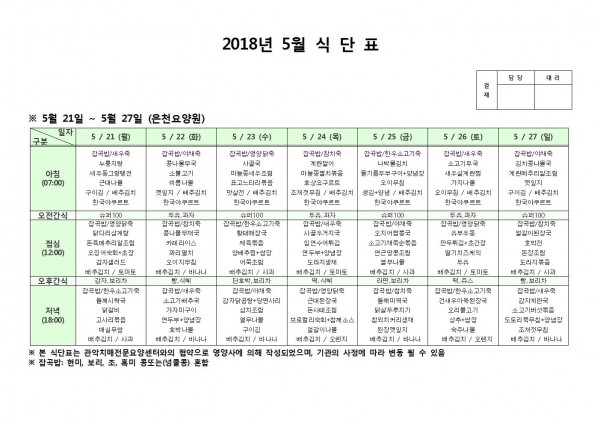 5월 넷째주 식단표 페이지 정보 작성자 은천노인복지회 작성일18-06-07 10:39 조회209,262회 댓글0건 관련링크 이전글 다음글 목록 답변 본문 5월 넷째주 식단표 이전글 다음글 목록 답변