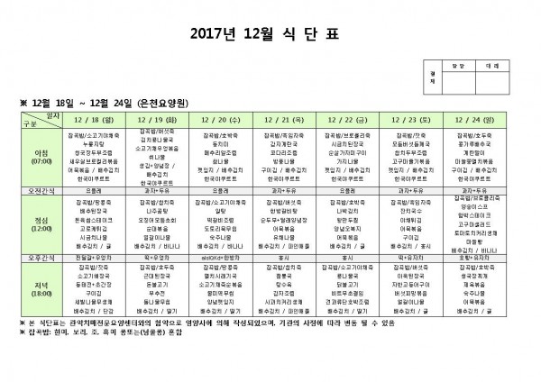 12월 넷째주 식단표 페이지 정보 작성자 은천노인복지회 작성일17-12-18 16:58 조회192,647회 댓글0건 관련링크 이전글 다음글 목록 답변 본문 12월 넷째주 식단표 이전글 다음글 목록 답변