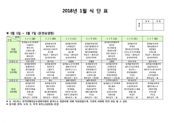 2018 1월 첫째주 식단표 페이지 정보 작성자 은천노인복지회 작성일18-01-03 11:34 조회194,284회 댓글0건 관련링크 이전글 다음글 목록 답변 본문 2018 1월 첫째주 식단표 이전글 다음글 목록 답변