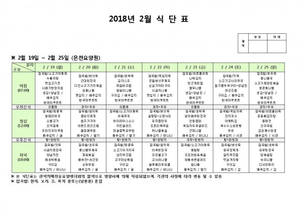 2월 셋째주 식단표 페이지 정보 작성자 은천노인복지회 작성일18-02-19 10:50 조회197,281회 댓글0건 관련링크 이전글 다음글 목록 답변 본문 2월 셋째주 식단표 이전글 다음글 목록 답변