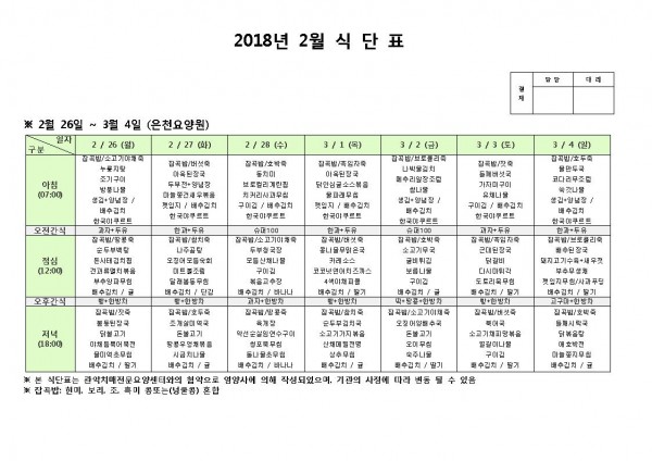 3월 첫째주 식단표 페이지 정보 작성자 은천노인복지회 작성일18-02-27 16:10 조회197,526회 댓글0건 관련링크 이전글 다음글 목록 답변 본문 3월 첫째주 식단표 이전글 다음글 목록 답변
