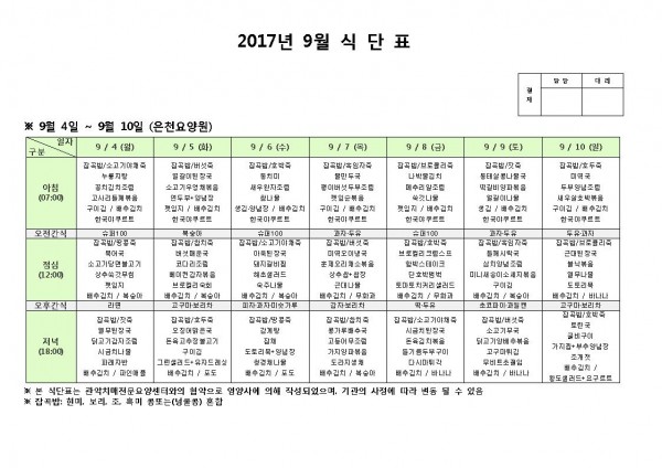 9월 첫째주 식단표 페이지 정보 작성자 은천노인복지회 작성일17-09-04 15:14 조회183,856회 댓글0건 관련링크 이전글 다음글 목록 답변 본문 9월 첫째주 식단표 이전글 다음글 목록 답변
