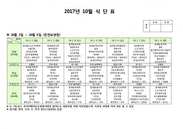 10월 첫째주 식단표 페이지 정보 작성자 은천노인복지회 작성일17-10-11 10:52 조회184,957회 댓글0건 관련링크 이전글 다음글 목록 답변 본문 10월 첫째주 식단표 이전글 다음글 목록 답변