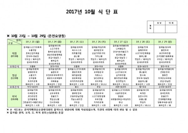 10월 넷째주 식단표 페이지 정보 작성자 은천노인복지회 작성일17-10-23 11:19 조회186,940회 댓글0건 관련링크 이전글 다음글 목록 답변 본문 10월 넷째주 식단표 이전글 다음글 목록 답변
