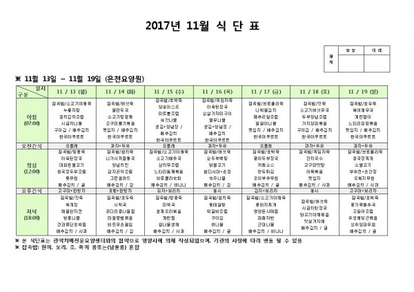 11월 셋째주 식단표 페이지 정보 작성자 은천노인복지회 작성일17-11-13 17:29 조회187,448회 댓글0건 관련링크 이전글 다음글 목록 답변 본문 11월 셋째주 식단표 이전글 다음글 목록 답변