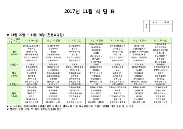 11월 넷째주 식단표 페이지 정보 작성자 은천노인복지회 작성일17-11-20 11:22 조회189,026회 댓글0건 관련링크 이전글 다음글 목록 답변 본문 11월 넷째주 식단표 이전글 다음글 목록 답변