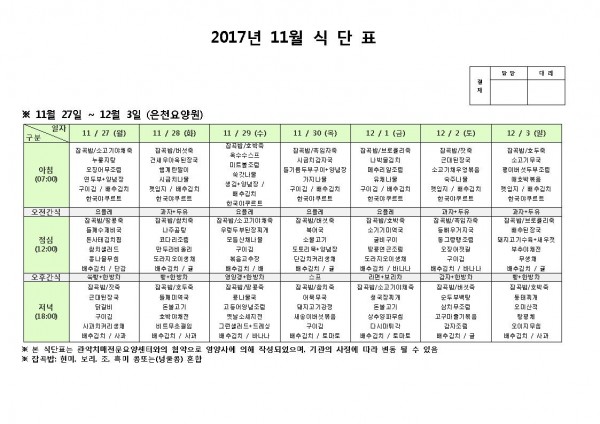 12월 첫째주 식단표 페이지 정보 작성자 은천노인복지회 작성일17-11-27 14:34 조회189,590회 댓글0건 관련링크 이전글 다음글 목록 답변 본문 12월 첫째주 식단표 이전글 다음글 목록 답변