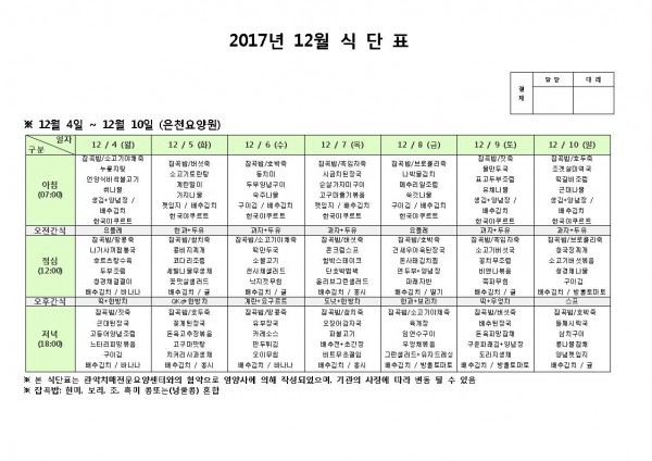 12월 둘째주 식단표 페이지 정보 작성자 은천노인복지회 작성일17-12-04 13:47 조회190,489회 댓글0건 관련링크 이전글 다음글 목록 답변 본문 12월 둘째주 식단표 이전글 다음글 목록 답변