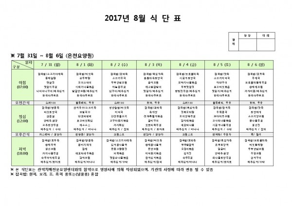 8월 첫째주 식단표 페이지 정보 작성자 은천노인복지회 작성일17-08-01 13:43 조회182,866회 댓글0건 관련링크 이전글 다음글 목록 답변 본문 8월 첫째주 식단표 이전글 다음글 목록 답변