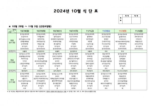 10월 다섯째 주 식단표 페이지 정보 작성자 은천노인복지회 작성일24-10-24 15:18 조회21,869회 댓글0건 관련링크 이전글 다음글 목록 답변 본문 . 이전글 다음글 목록 답변
