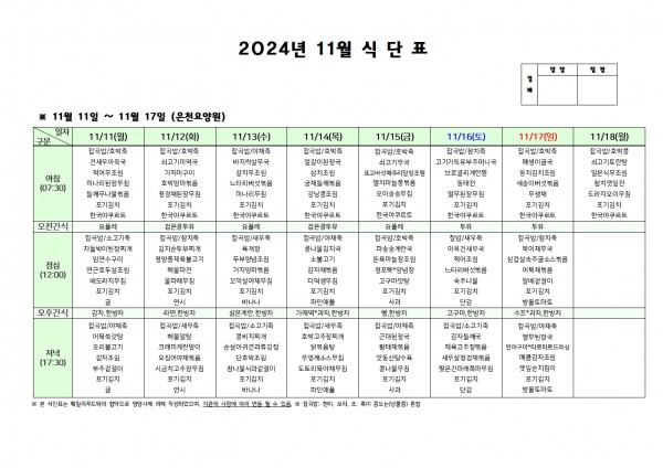 11월 둘째주 식단표 페이지 정보 작성자 은천노인복지회 작성일24-11-07 16:50 조회21,808회 댓글0건 관련링크 이전글 다음글 목록 답변 본문 . 이전글 다음글 목록 답변