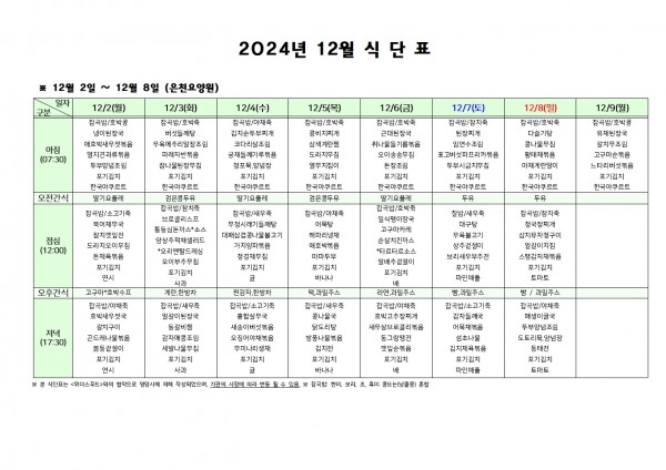 12월 첫째주 식단표 페이지 정보 작성자 은천노인복지회 작성일24-11-29 16:53 조회21,038회 댓글0건 관련링크 이전글 다음글 목록 답변 본문 . 이전글 다음글 목록 답변