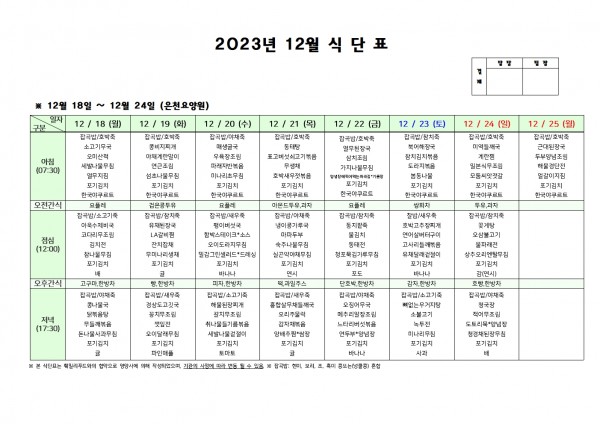 12월 넷째주 식단표 페이지 정보 작성자 은천노인복지회 작성일23-12-15 11:21 조회36,981회 댓글0건 관련링크 이전글 다음글 목록 답변 본문 . 이전글 다음글 목록 답변