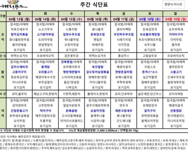 4월 둘째주 식단표 페이지 정보 작성자 은천노인복지회 작성일26-04-14 14:54 조회31회 댓글0건 관련링크 다음글 목록 답변 본문 4월 둘째주 어르신 식단표 안내해 드립니다. 정성과 영양을 담아 준비하겠습니다. 다음글 목록 답변