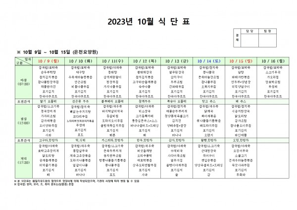 10월 둘째주 식단표 페이지 정보 작성자 은천노인복지회 작성일23-10-05 17:41 조회39,643회 댓글0건 관련링크 이전글 다음글 목록 답변 본문 . 이전글 다음글 목록 답변