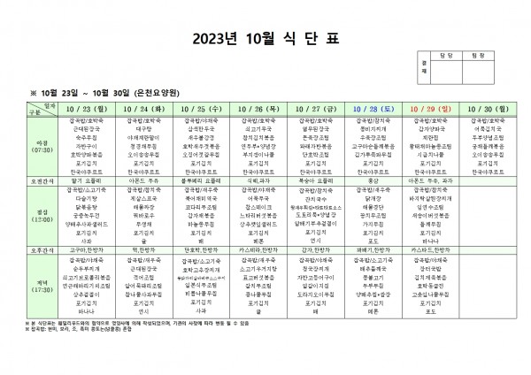 10월 넷째주 식단표 페이지 정보 작성자 은천노인복지회 작성일23-10-19 16:41 조회39,583회 댓글0건 관련링크 이전글 다음글 목록 답변 본문 . 이전글 다음글 목록 답변