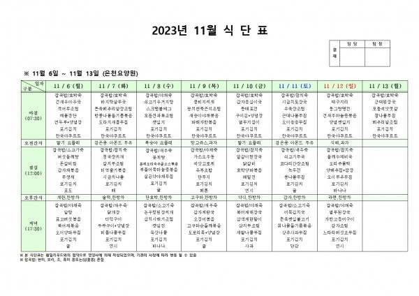 11월 둘째주 식단표 페이지 정보 작성자 은천노인복지회 작성일23-11-02 17:19 조회39,158회 댓글0건 관련링크 이전글 다음글 목록 답변 본문 . 이전글 다음글 목록 답변