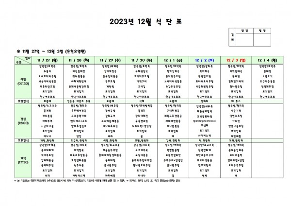 12월 첫째주 식단표 페이지 정보 작성자 은천노인복지회 작성일23-11-24 09:37 조회37,271회 댓글0건 관련링크 이전글 다음글 목록 답변 본문 . 이전글 다음글 목록 답변