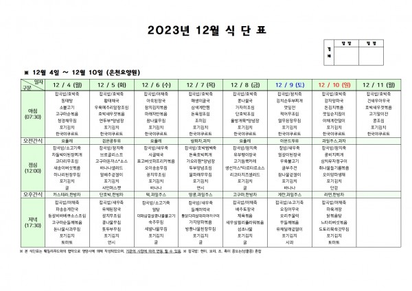 12월 둘째주 식단표 페이지 정보 작성자 은천노인복지회 작성일23-12-01 16:35 조회35,013회 댓글0건 관련링크 이전글 다음글 목록 답변 본문 . 이전글 다음글 목록 답변