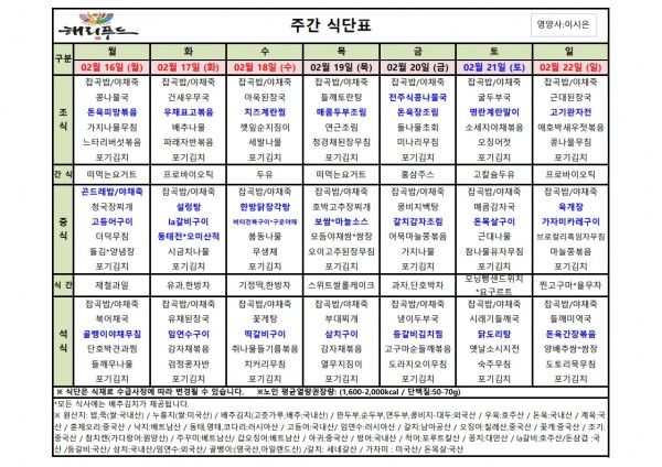 2월 셋째주 식단표 페이지 정보 작성자 은천노인복지회 작성일26-02-12 17:43 조회3,653회 댓글0건 관련링크 이전글 다음글 목록 답변 본문 2월 셋째주 어르신 식단표 안내해 드립니다. 정성과 영양을 담아 준비하겠습니다. 이전글 다음글 목록 답변