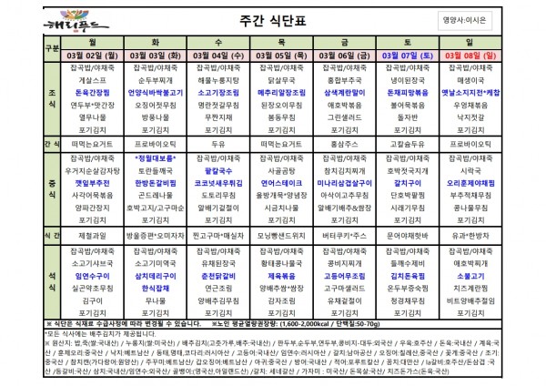 3월 첫째주 식단표 페이지 정보 작성자 은천노인복지회 작성일26-02-27 13:13 조회2,611회 댓글0건 관련링크 이전글 다음글 목록 답변 본문 2월 넷째주 어르신 식단표 안내해 드립니다. 정성과 영양을 담아 준비하겠습니다. 이전글 다음글 목록 답변