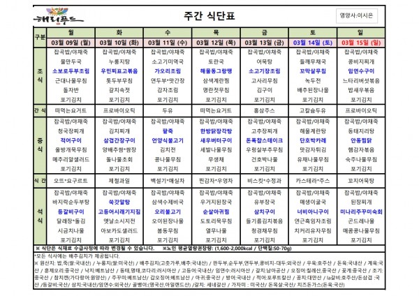 3월 둘째주 식단표 페이지 정보 작성자 은천노인복지회 작성일26-03-06 15:04 조회2,201회 댓글0건 관련링크 이전글 다음글 목록 답변 본문 3월 둘째주 어르신 식단표 안내해 드립니다. 정성과 영양을 담아 준비하겠습니다. 이전글 다음글 목록 답변