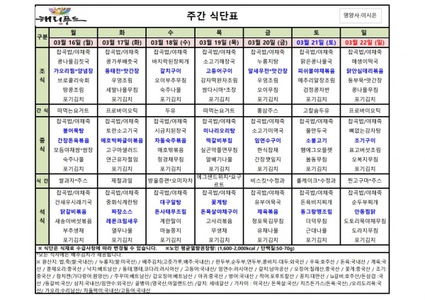 3월 셋째주 식단표 페이지 정보 작성자 은천노인복지회 작성일26-03-13 15:20 조회2,034회 댓글0건 관련링크 이전글 다음글 목록 답변 본문 3월 셋째주 어르신 식단표 안내해 드립니다. 정성과 영양을 담아 준비하겠습니다. 이전글 다음글 목록 답변