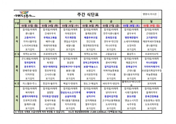 3월 넷째주 식단표 페이지 정보 작성자 은천노인복지회 작성일26-03-20 16:40 조회782회 댓글0건 관련링크 이전글 다음글 목록 답변 본문 3월 넷째주 어르신 식단표 안내해 드립니다. 정성과 영양을 담아 준비하겠습니다. 이전글 다음글 목록 답변