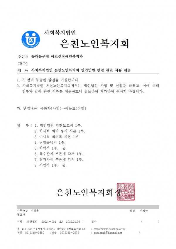 사회복지법인 은천노인복지회 법인 임원 변경 페이지 정보 작성자 은천노인복지회 작성일22-01-06 13:54 조회29,598회 댓글0건 관련링크 목록 본문 사회복지법인 은천노인복지회 법인임원이 아래와 같이 변경되었습니다. 변경내용: 목화자(사임)->이동호(선임) 목록